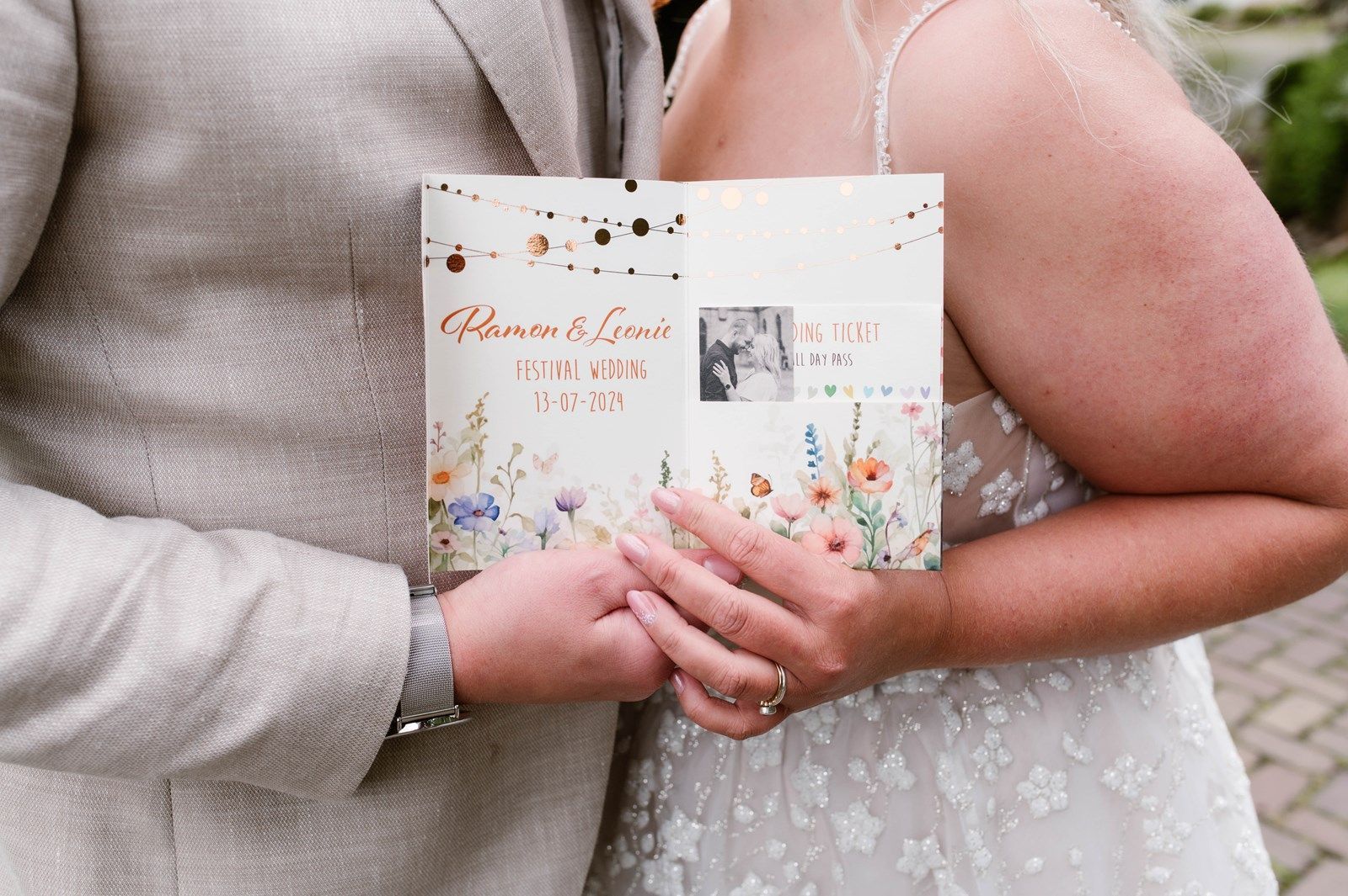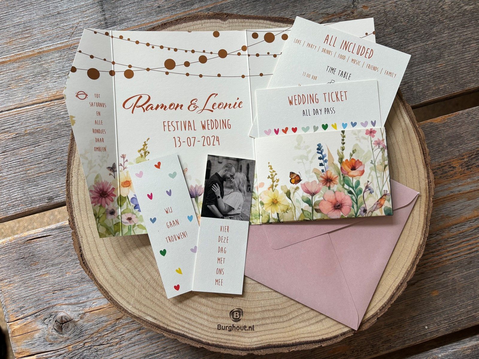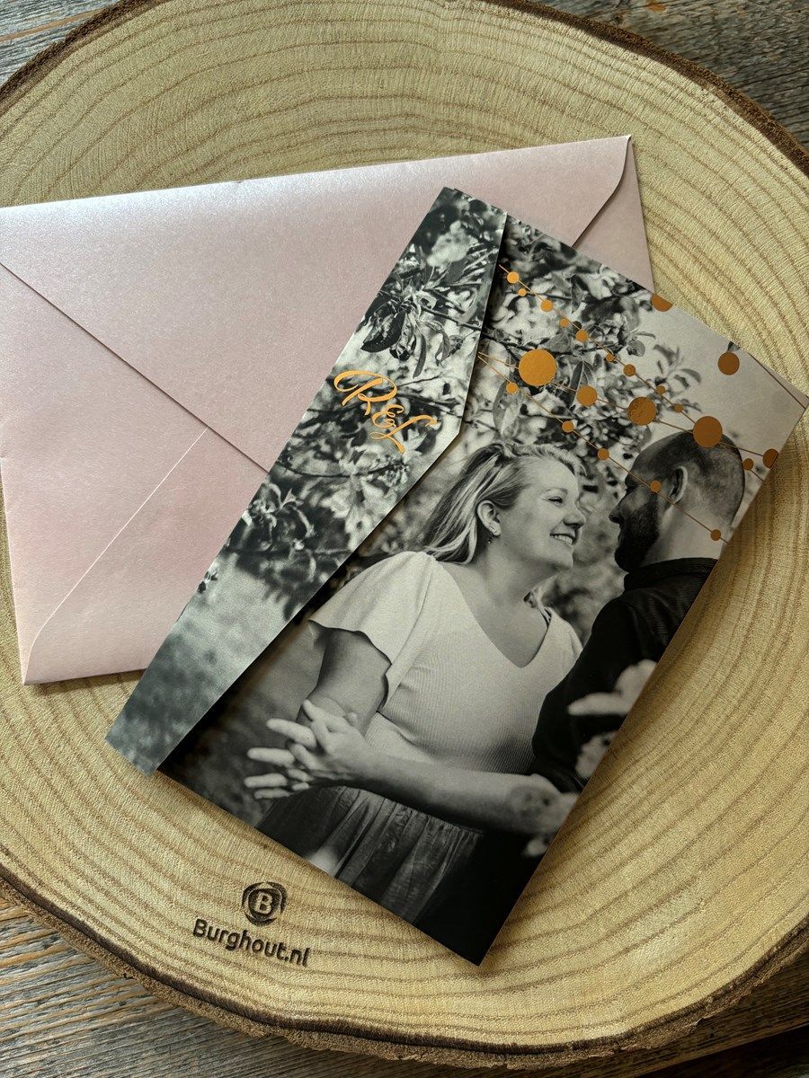 Afgelopen voorjaar kwamen Leonie en Ramon bij mij in de drukkerij. ‘Hayke, we gaan trouwen en willen een pocketfold kaart, we hebben mooie foto’s voor de insteekkaartjes..’